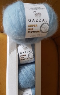 Газзал супер кид мохер. Нить подходит для вязания зимних теплых вещей. Готовое изделие сильно пушится. Рекомендованный размер спиц - № 3-5. Рекомендованный размер крючка - № 2,5-3.