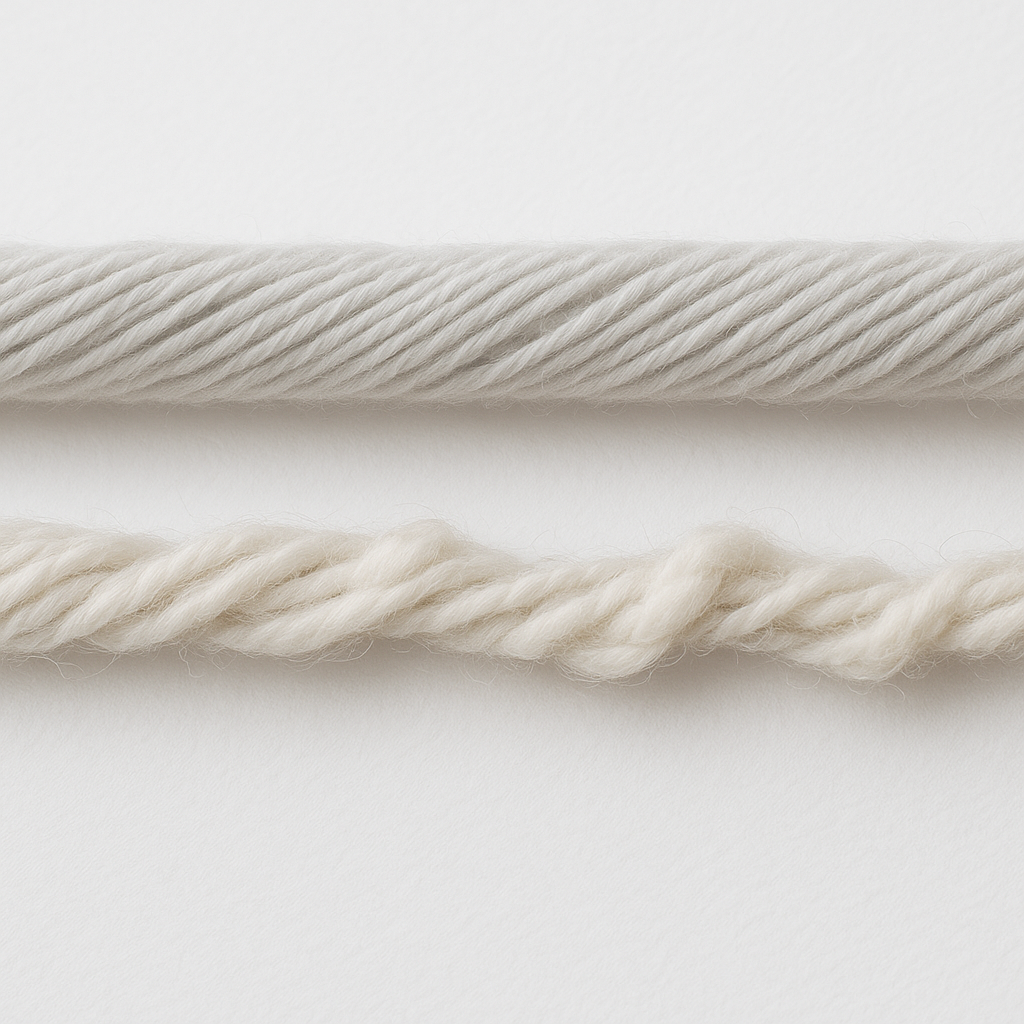Материалы из микрополиэстера, мерсеризованного хлопка и акрила обычно отличаются стабильной структурой. У шерстяных волокон микнес ниже, так как нити содержат естественные утолщения. Смесовые составы дают более равномерную нить, подходящую для ровного полотна.